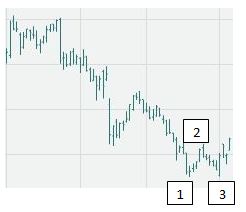A simple technique to buy the turn higher from the low, is to wait for a failed double bottom. If you take a look at the image below, prices fell to annual lows with an extreme bottom (1). A subsequent five session bounce to a higher price (2) stalled and approached the bottom but did not break below that base. New higher lows (3) formed that double bottom.